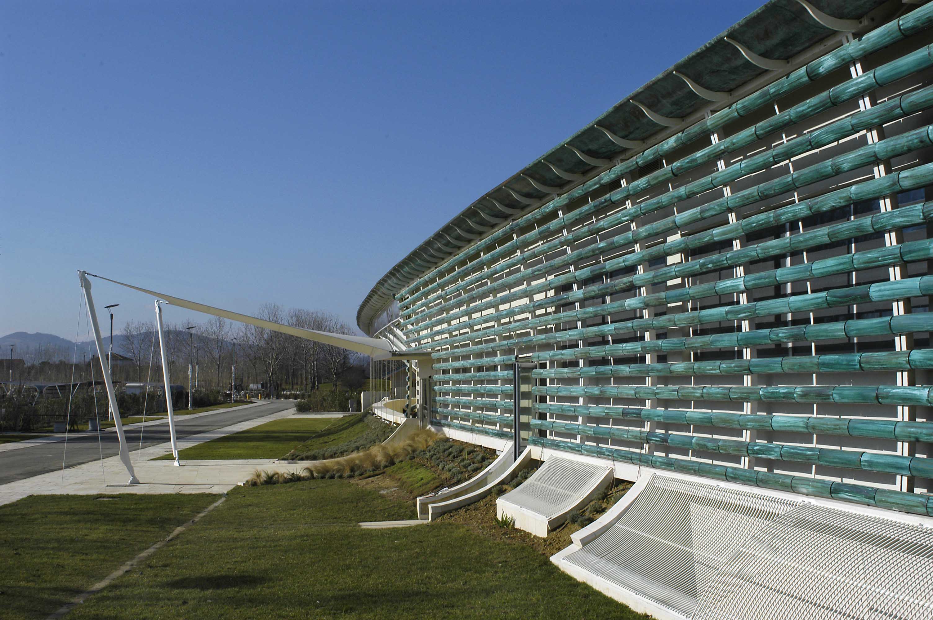 L’attacco a terra e la copertura costituiscono gli elementi caratteristici della costruzione che si sviluppa planimetricamente seguendo l’andamento di un ellisse che disegna tutto lo spazio a terra al suo contorno delimitando la grande piscina su cui si affaccia il fronte nord-ovest e la pavimentazione esterna.