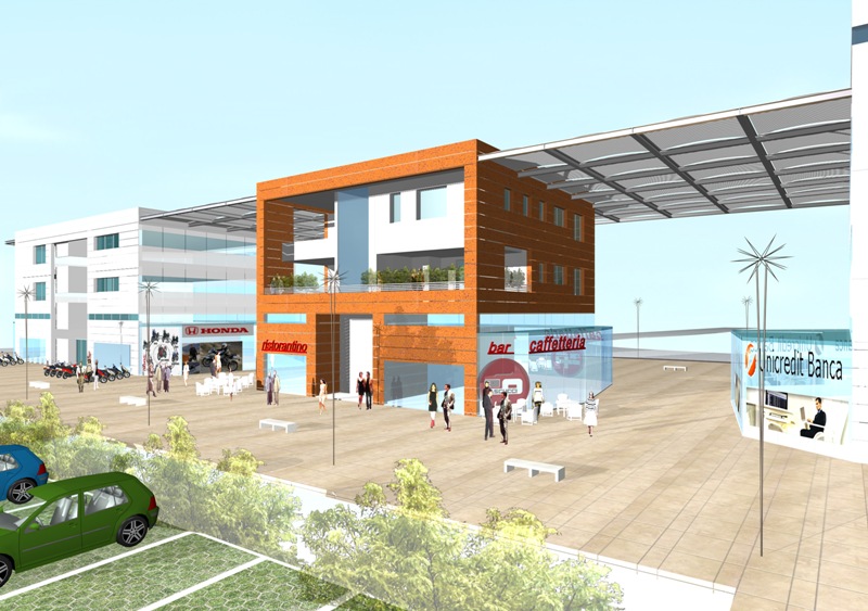- Il fabbricato 1B si sviluppa su cinque livelli di cui uno interrato destinato ad autorimessa privata. Il piano interrato è diviso in due autorimesse servita da una unica rampa; l’autorimessa più piccola con capienza di 11 auto e 8 moto, quella più grande con cento posti auto. La parte fuori terra dell’edificio è costituita da tre corpi di fabbrica collegati a livello di copertura dei piani utili da una pensilina frangisole in metallo. Su tutti tre i blocchi al piano terra vengono realizzati locali commerciali in unità di varie metrature. I piani superiori sono destinati ad uffici e relativa superficie accessoria nei corpi di fabbrica laterali mentre in quello centrale da cedersi in permuta all’Amministrazione Comunale sono ricavati i locali da destinare a Comunità Socio Educativa Riabilitativa.