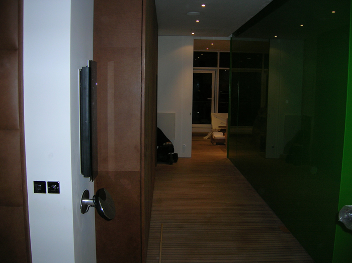 Un effetto shock sul corridoio centrale che corre,attraverso una vetrata,verso il terrazzino affacciato sul parco.